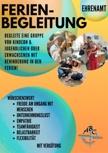 Für unsere Ferienbegleitung suchen wir engagierte Menschen, die im Team gemeinsam spannende und abwechslungsreiche Ferien gestalten. Die Ferienbegleitungen für Kinder und Jugendliche finden in allen Schulferien statt. Für Erwachsene findet die Ferienbegleitung in zwei Wochen im Sommer statt. Im Team bietet ihr den Teilnehmenden die Möglichkeit, gemeinsame Aktivitäten im ABC und neue Orte in und um Freiburg zu entdecken und eine schöne Zeit in Gemeinschaft zu genießen. Als Ferienbegleitung sorgst du nicht nur für die Sicherheit und das Wohlbefinden der Teilnehmenden, sondern begleitest insbesondere ein bis zwei Teilnehmende bei Ausflügen, Spielen und Workshops. Wenn du verantwortungsbewusst und offen bist und Spaß daran hast, Menschen mit Unterstützungsbedarf in ihren Ferien zu begleiten, freuen wir uns von dir zu hören!